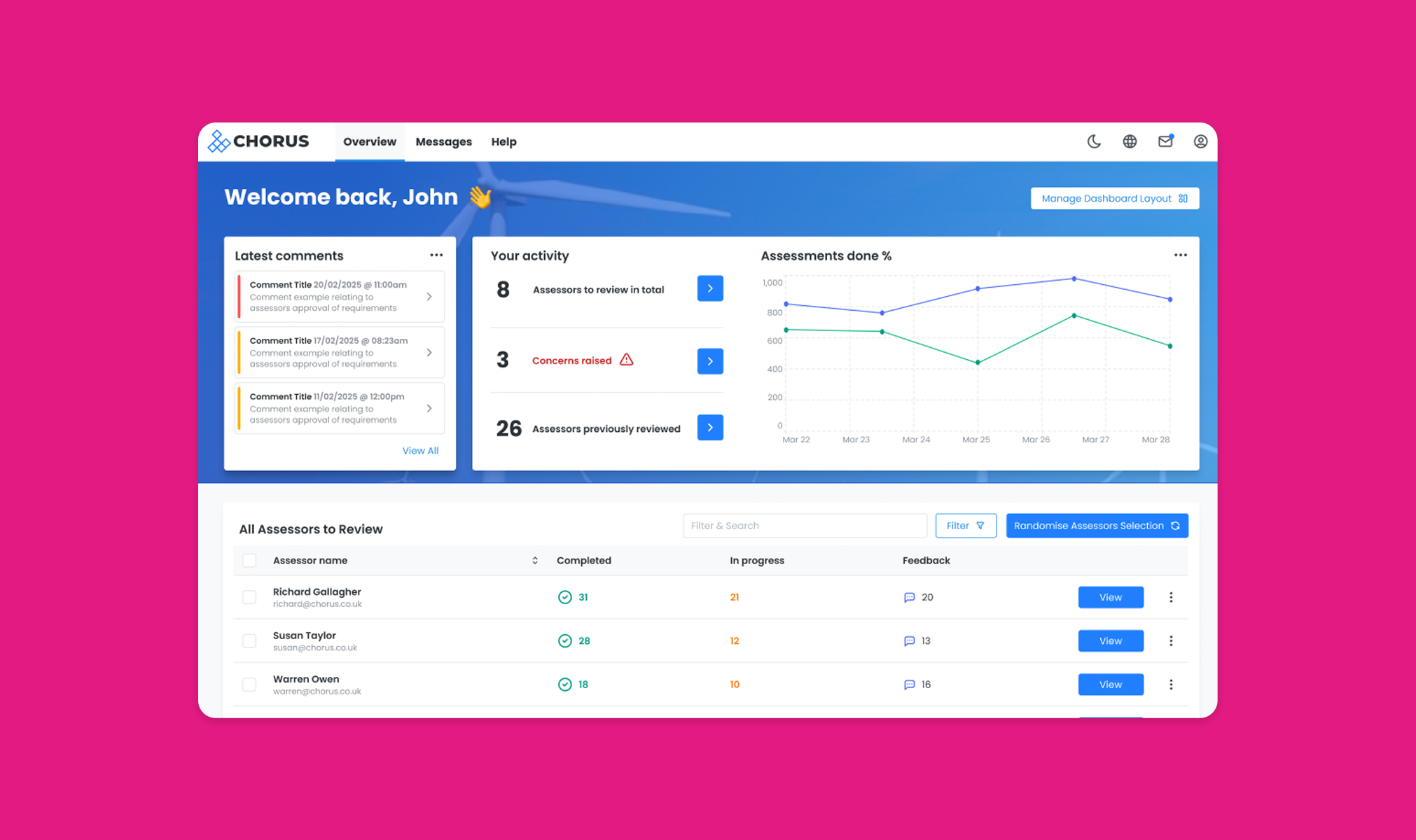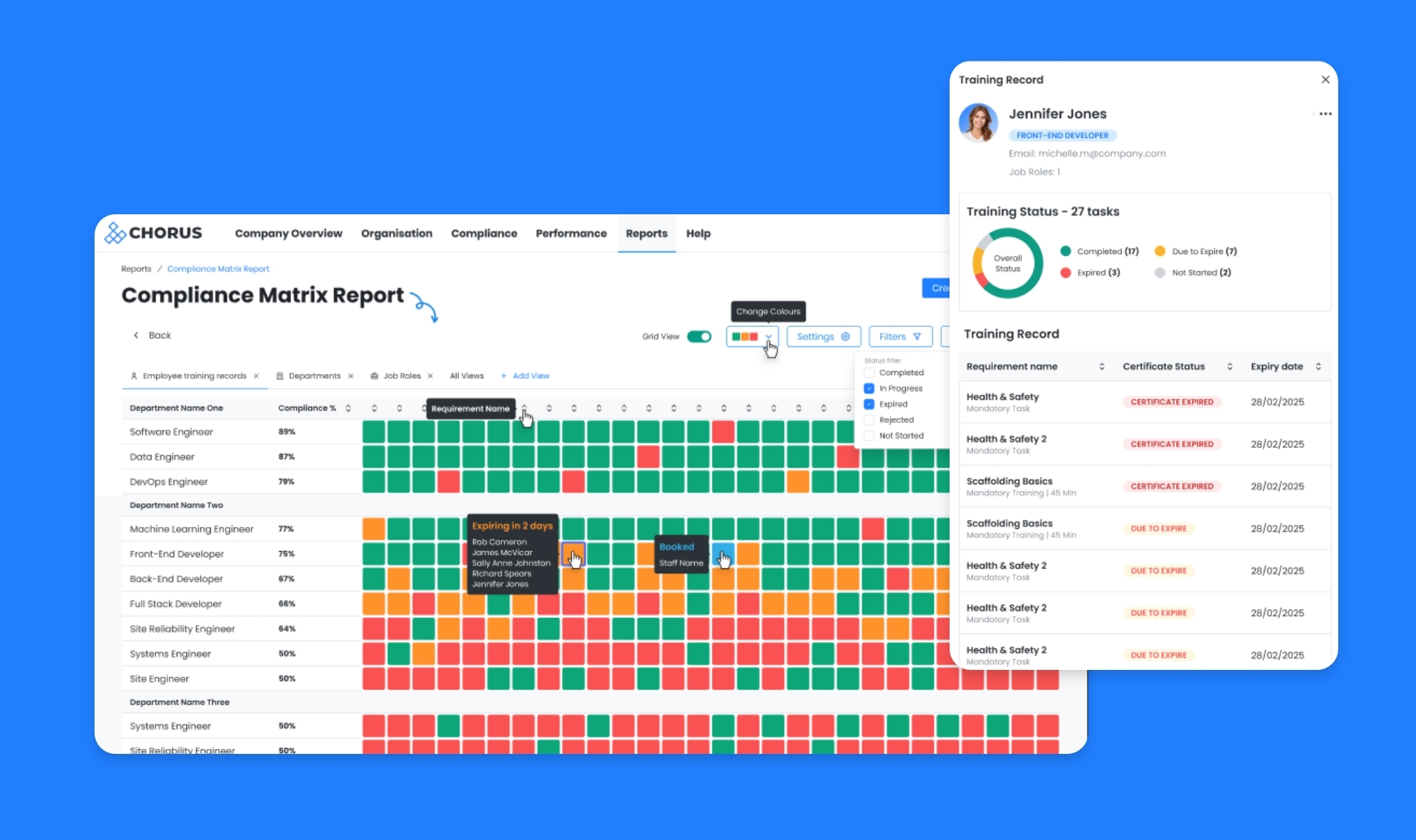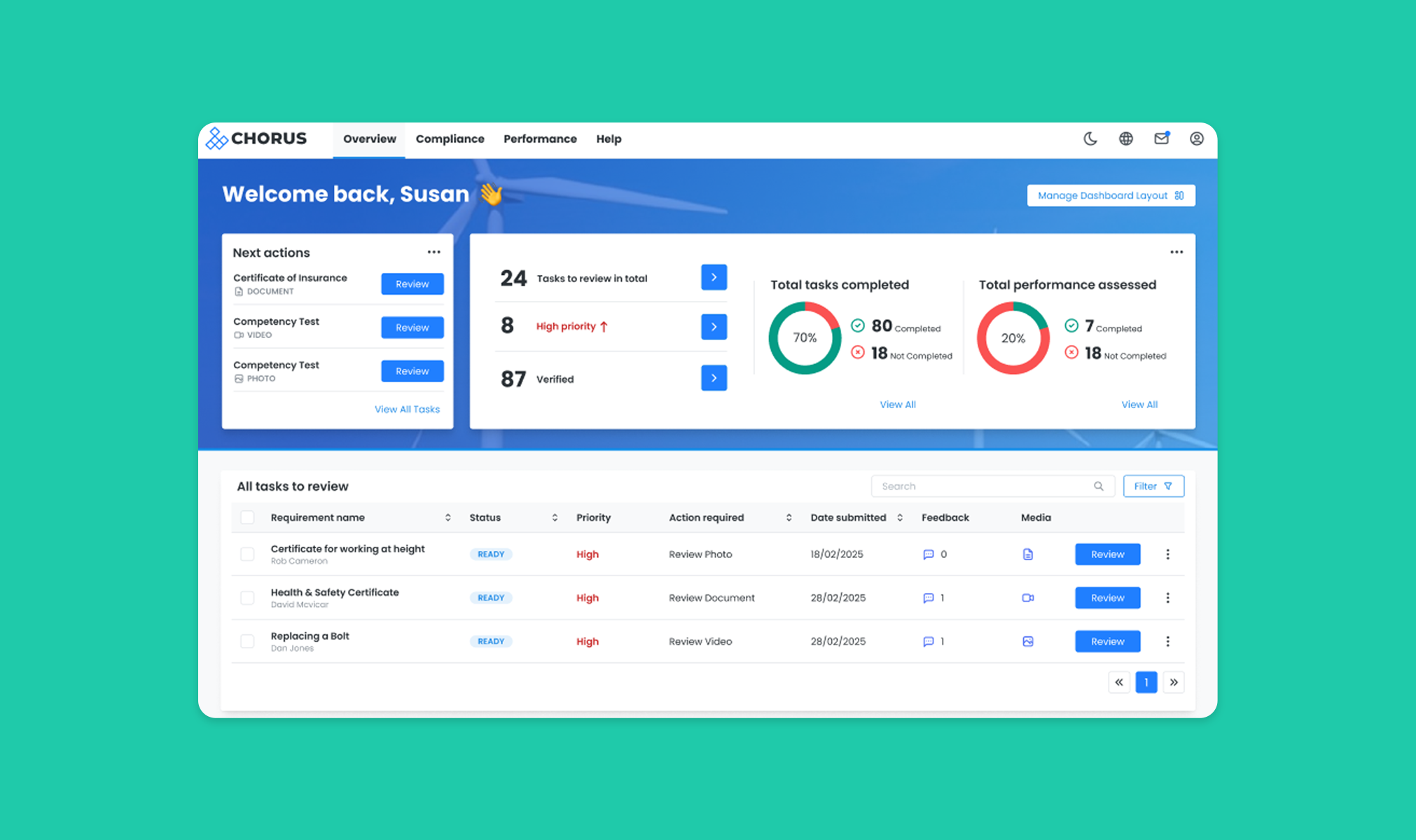 Chorus brings together training logs, assessments, and verified evidence into a clear dashboard. Managers can see at a glance who is competent, who needs reassessment, and where there are gaps.