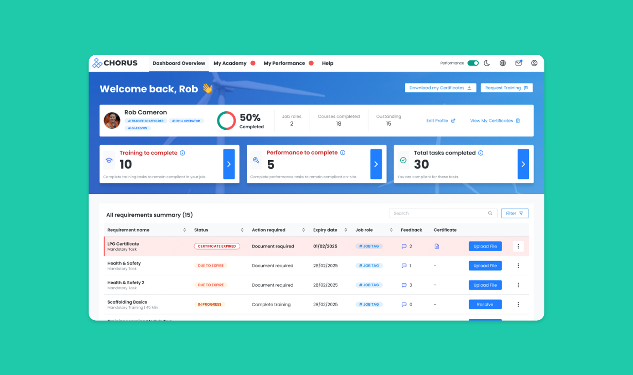 Chorus makes onboarding simple. New hires upload evidence they can handle the hazards they’ll face — and you have documented proof, right from the start.
